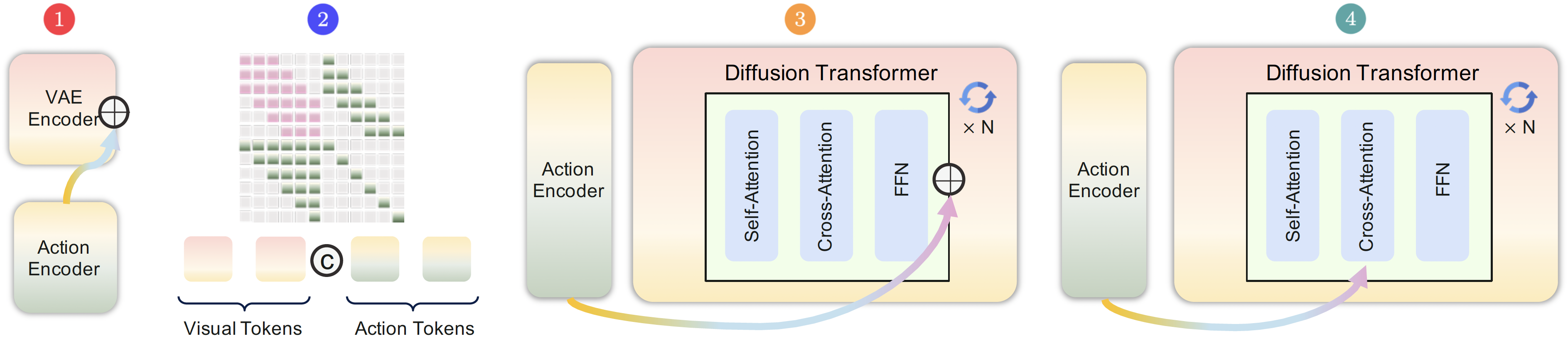 On the model side, we did not try just one action-injection scheme. We trained four variants in parallel. The real difference between them is not whether they receive actions at all, but how deep actions enter the trunk and where they begin to participate in state evolution. Figure 7 in the paper lays out the four designs clearly:
