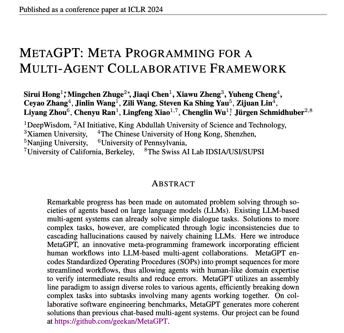 - [3] MetaGPT: Meta Programming for A Multi-Agent Collaborative Framework. ICLR 2024.