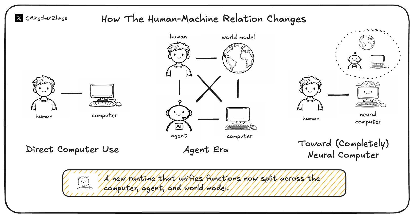 Seen this way, the main human-machine relationship shifts. In the conventional era, people mainly interact with computers. In the agent era, they increasingly interact with agents, which then call the computer on their behalf. World models occupy a parallel position: they can serve humans or agents, but they do not themselves close the loop of getting work done. NC goes one step deeper. It asks whether some of the responsibilities now split across computers, agents, and world models can be drawn back into the same learning machine. At that point, the object in front of the user would no longer be an agent using a computer for them. It would be a Neural Computer.
